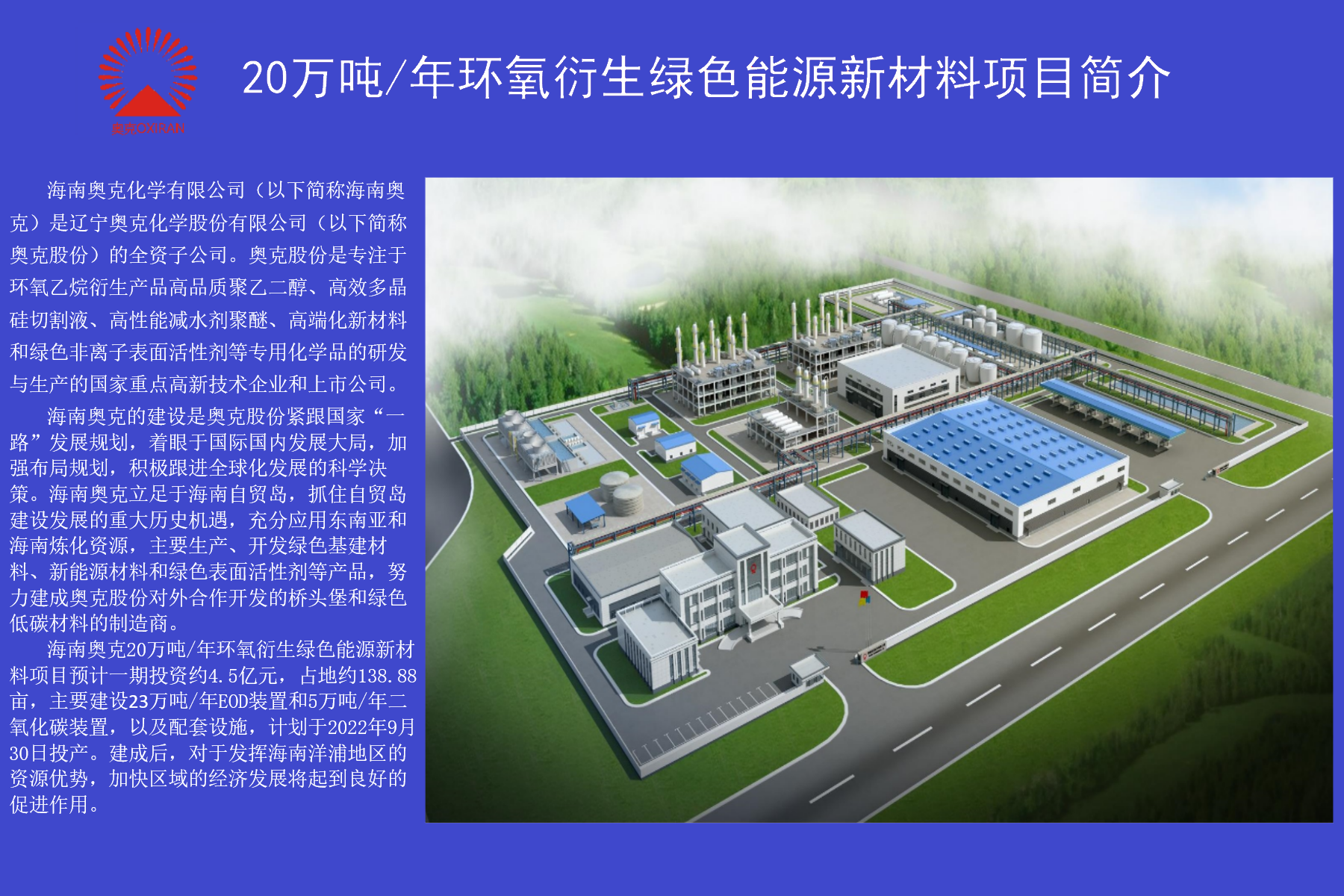 海南奧克是奧克股份在全國(guó)五大區(qū)域的拓展,前期在洋浦經(jīng)濟(jì)開發(fā)區(qū)工委管委會(huì)、中國(guó)石化海南煉化公司、中石化化工銷售(海南)公司和洋浦國(guó)際等的大力支持下,于2021年2月5日注冊(cè)成立,注冊(cè)資本11,520萬元,占地面積約140畝,擬投資4.5億元,主要建設(shè)23萬噸/年EOD裝置以及配套設(shè)施,預(yù)計(jì)于2022年9月30日建成投產(chǎn),主要生產(chǎn)、開發(fā)綠色基建材料、新能源材料和綠色表面活性劑等產(chǎn)品。該項(xiàng)目的投資建設(shè),是奧克股份堅(jiān)持“立足環(huán)氧乙烯創(chuàng)造價(jià)值”,滿足華南、海外東南亞不斷擴(kuò)大市場(chǎng)的戰(zhàn)略需要;是奧克股份依托中石化海南煉化公司環(huán)氧乙烷原料優(yōu)勢(shì)資源,為奧克快速發(fā)展和海南地方經(jīng)濟(jì)做出貢獻(xiàn)的戰(zhàn)略需要;也是完善奧克的市場(chǎng)營(yíng)銷網(wǎng)絡(luò)體系,打通現(xiàn)有區(qū)位空間格局,共同釋放協(xié)同效應(yīng),提升奧克在華南、海外等境內(nèi)外的市場(chǎng)份額的戰(zhàn)略需要;更是面向奧克“十四五”規(guī)劃及2035遠(yuǎn)景目標(biāo),邁向現(xiàn)代化、國(guó)際化發(fā)展的戰(zhàn)略需要。